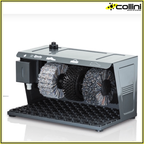 La macchina è dotata di una struttura in acciaio in cui sono presenti tre spazzole: una per pulire e altre due, una chiara e una scura a seconda della scarpa da lustrare, per una perfetta lucidatura. Di fianco alle spazzole è posizionato il pratico dispenser con il liquido lucidante neutro che viene erogato in maniera automatica sempre mediante pressione esercitata dal piede sulla valvola alla base del dispenser. Lo sporco si deposita sul tappetino in plastica che viene rimosso manualmente per una rapida pulizia.