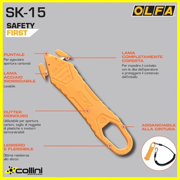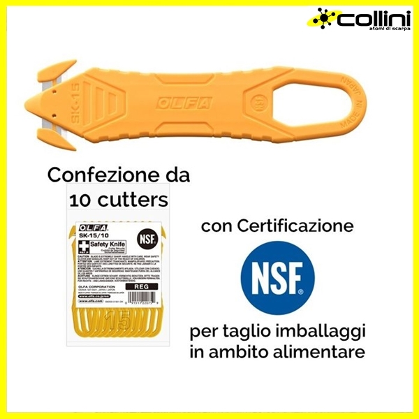 Ambedue sono ideali per tagliare imballaggi di carta, cellophane, reggette in plastica, nastri e film di plastica. Il coltello usa e getta SK-15 ha inoltre ottenuto la certificazione NSF per il taglio d'imballaggi in ambito alimentare.