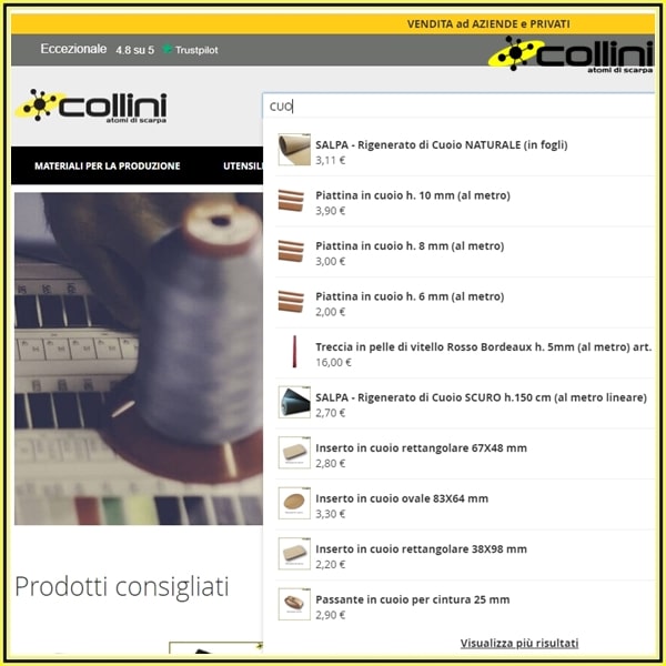 Altra funzionalità interessante è quella proposta della barra di ricerca posizionata in alto sul nostro sito web. Quando digiti alcune lettere dell’articolo che stai cercando, la barra di ricerca visualizzerà già dalle prime lettere i diversi prodotti disponibili che contengono quanto appena scritto. Il sistema quindi ti fornisce i risultati più pertinenti alla tua ricerca utilizzando l’inserimento di lettere o parole chiave basandosi su un motore di ricerca intelligente creato appositamente per l’e-commerce.